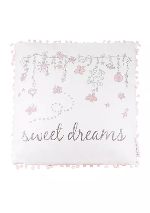 Perfect for any little girl, the Alexi Sweet Dreams Pillow is decorated with a soft pink pom pom trim. This pillow features the sentiment ‘sweet dreams’ embroidered in gray with pink butterflies and flowers above.