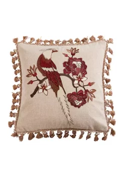 The Bird decorative pillow matches perfectly with the Levtex Home Astrid bedding collection. This pillow is sized at 18-inches x 18-inches and features a regal bird embroidered in rich colors on a textured ground, edged in a brocade trim. The burgundy red, brown, cream, and taupe color palette make this a versatile accessory for your bed, couch, or favorite chair. The pillow comes pre-filled with a soft luxurious feather inner.