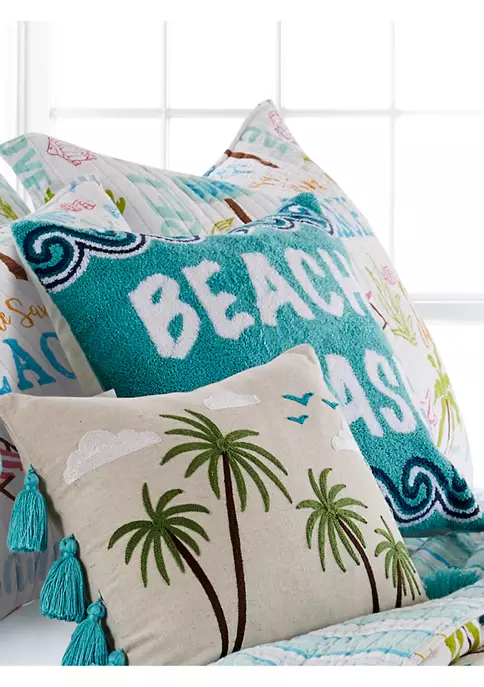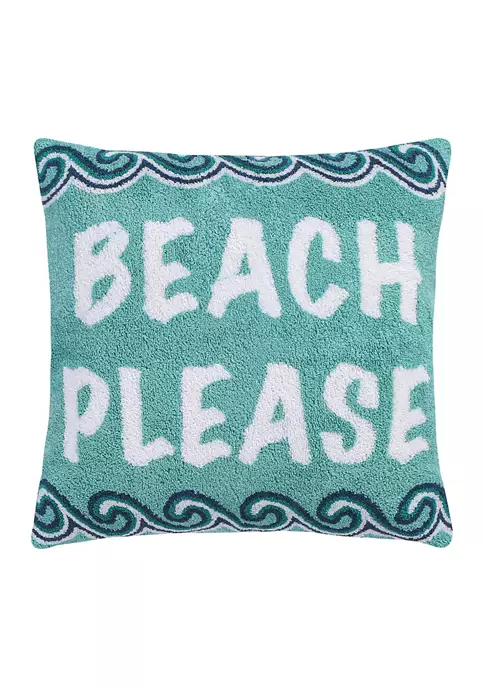 The Beach Decorative Pillow matches perfectly with the Levtex Home Beach Days bedding collection. This pillow is sized at 18 inches by 18 inches and features the words “BEACH PLEASE” towel-stitched with a wave border top and bottom. The sophisticated color palette makes this a versatile accessory for your bed, couch, or favorite chair. The pillow comes pre-filled with a soft, luxurious feather inner.