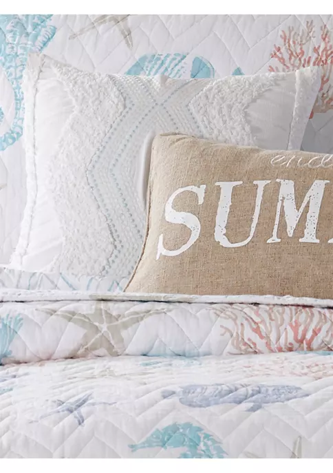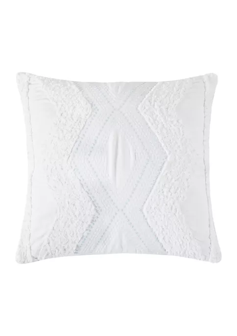 The Tufted Chevron Decorative Pillow matches perfectly with the Levtex Home Blue Sea Bedding Collection. This pillow is sized at 18 inches by 18 inches and features a chevron pattern in tufted cream chenille with teal embroidered accents. The color palette makes this a versatile accessory for your bed, couch, or favorite chair. The pillow comes pre-filled with a soft luxurious feather inner.
