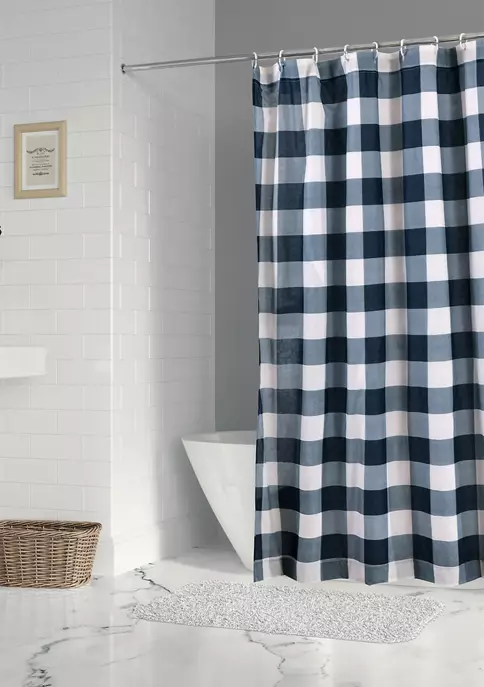 Refresh your bathroom with this navy and cream plaid shower curtain from Levtex, finished with easy button holes.
