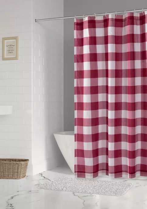 Refresh your bathroom with this red and cream plaid shower curtain from Levtex, finished with easy button holes.