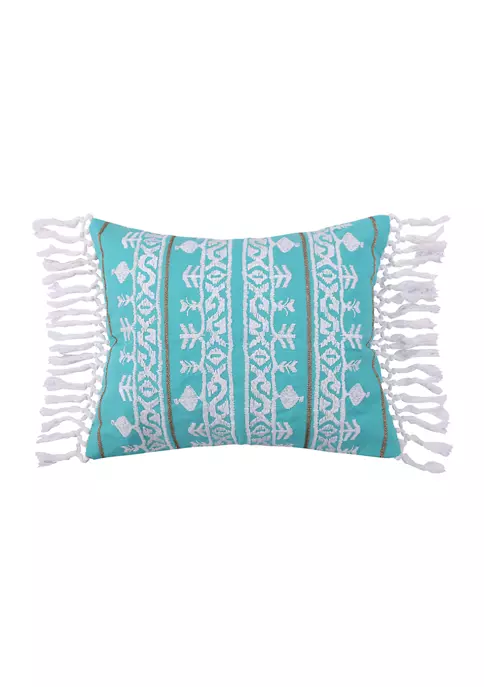 The Deniza Teal Embroidered Fringe Pillow by Levtex Home is a lovely addition to the Deniza bedding collection designed in brilliant teal with delicate white embroidery and stylish white fringe detail along the sides. Pre-washed and luxury oversized with an invisible zipper, this 14 in x 18 in pillow comes with a compressed duck feather insert and is made with soft 100% cotton.