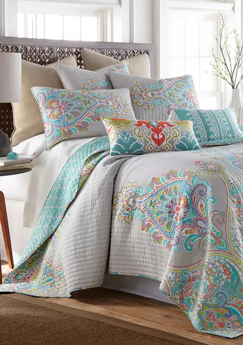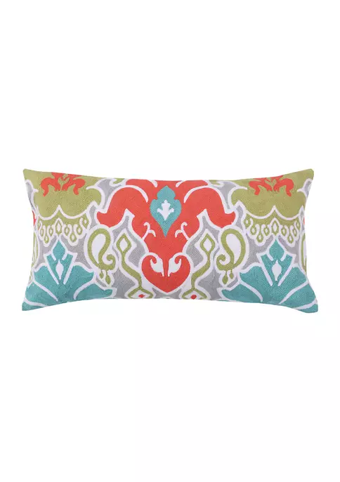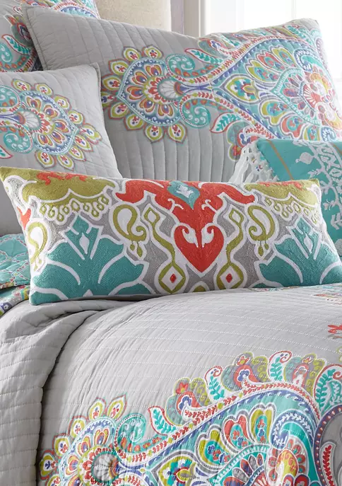 The Deniza Crewel Multi Pillow by Levtex Home is a luxurious addition to the Deniza bedding collection featuring a dazzling damask design in distinctive crewel embroidery in vivid shades of teal, red, green and gray. Pre-washed and luxury oversized with an invisible zipper, this pillow comes with a compressed duck feather insert and is made with soft 100% cotton. Imported.