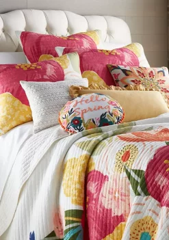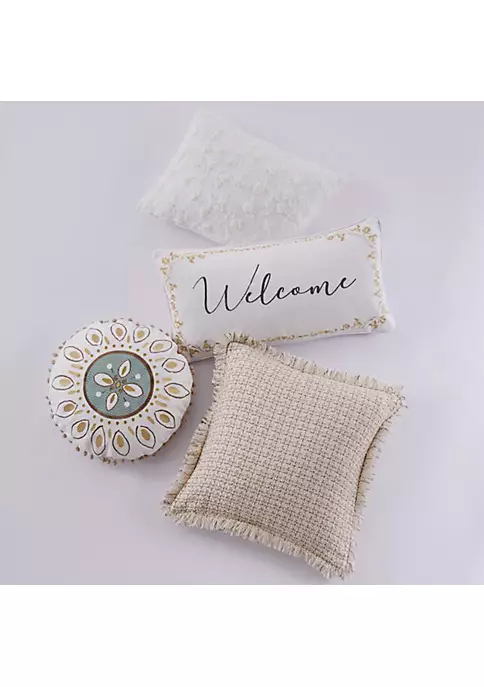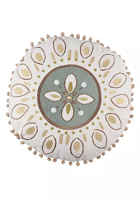 The Round Medallion decorative pillow matches perfectly with the Levtex Home Cosima bedding collection. This pillow is sized at 18in. Round and features A detailed medallion embroidered in rich colors on a textured cream ground and finished with a pom pom edge. The color palette makes this a versatile accessory for your bed, couch or favorite chair. The pilow comes pre-filled with a soft luxurious feather inner.