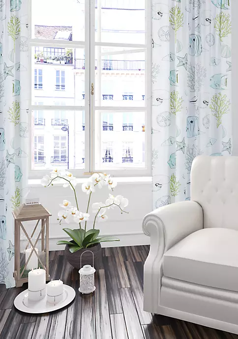 The Aegean Drape Panel features fish in sea glass hues to invoke a relaxing atmosphere in your beach dΓ©cor. This imported cotton 55 in x 84 in drape panel has a rod pocket, polyester backing, and is fully machine-washable.