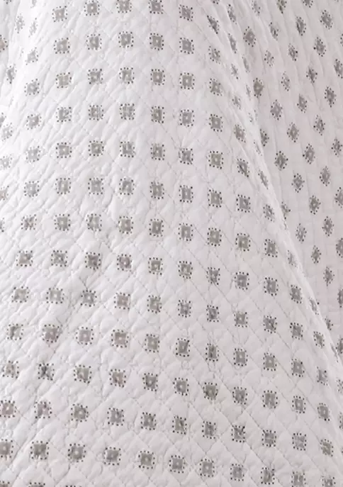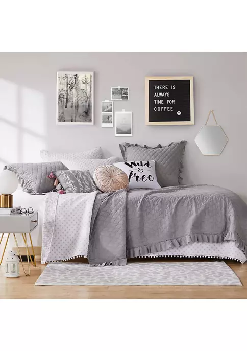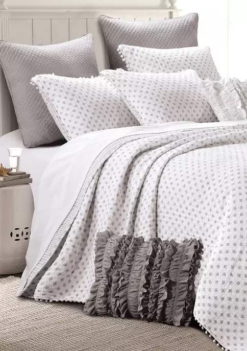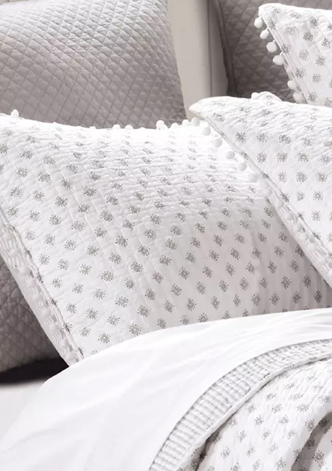 The Astoria Reversible Full/Queen Quilt Set by Levtex Home is inspired by classic quilts. This medallion pom pom design will immediately transform your bedroom. Made with the softest lightweight cotton, this reversible quilt features a ditsy medallion in grey, reversing to a grey and white stripe on the other. The Full/Queen Quilt Set is machine washable and includes the quilt (88x92in.) and two standard pillow shams (26x20in.) Enjoy this for years to come!
