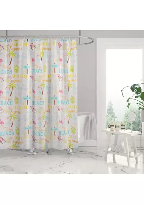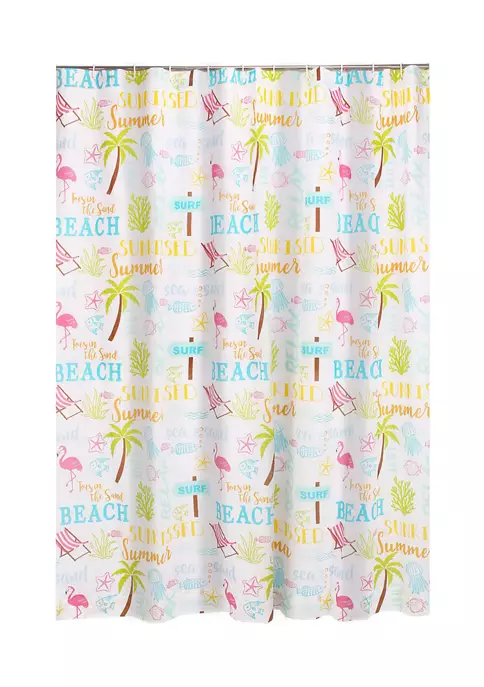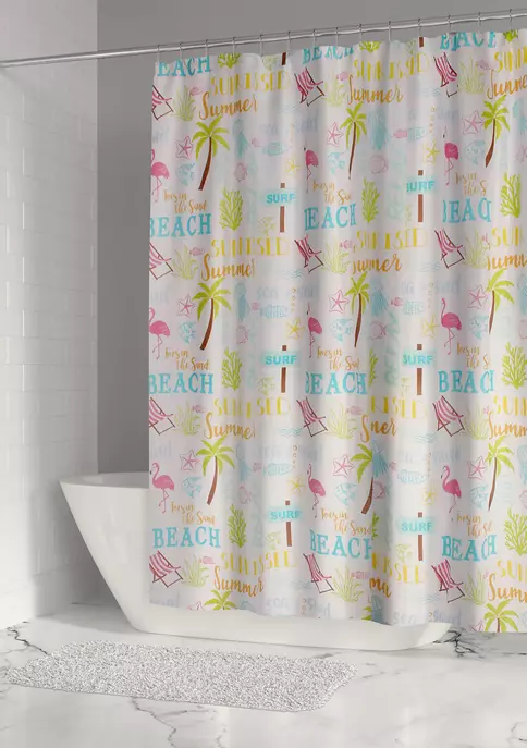 The Beach Days Reversible Shower Curtain (72x72in.) with 12 grommet wholes by Levtex Home is inspired by Summer days at the beach. Offered in shades of teal, blue, yellow, green, brown and pink, this design will immediately transform any bathroom Made with 100% cotton, this shower curtain features beach motifs, flamingos, palm trees and fun words. The shower curtain is machine washable and does not include any hardware or waterproof liner. Enjoy this for years to come!