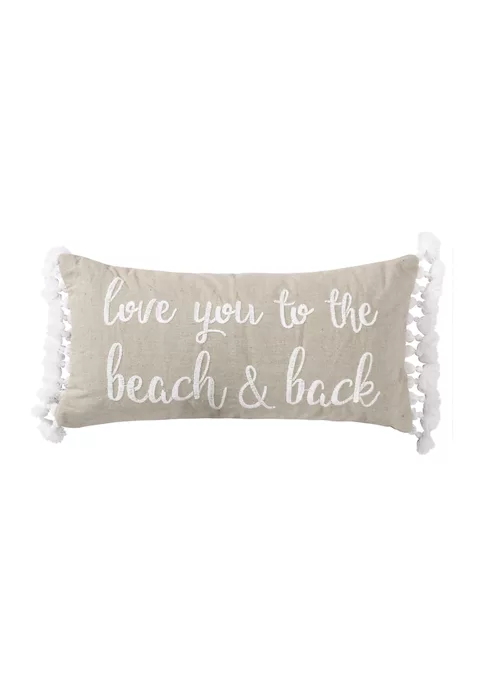 The Beacon Beach and Back Pillow is inspired by a journey under the sea. The quote “I LOVE YOU TO THE BEACH AND BACK” is stitched in white onto the oblong throw pillow. The pillow is size 12 inches by 24 inches and features decorative tassels on each side. It’s pre-filled with a soft luxurious feather inner.