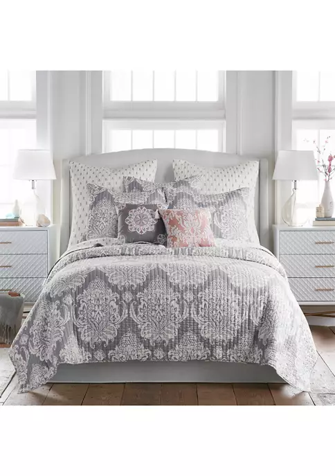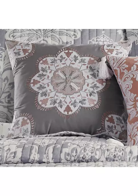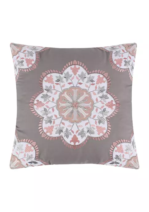 The Embroidered Medallion decorative pillow matches perfectly with the Levtex Home Belhaven bedding collection. This pillow features a large medallion appliqued and embroidered in exquisite detail on a dark gray ground The color palette makes this a versatile accessory for your bed, couch, or favorite chair. The pillow comes pre-filled with a soft luxurious feather inner.