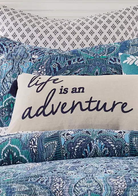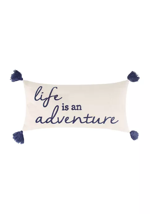 The Life is an Adventure words decorative pillow matches perfectly with the Levtex Home Bellamy Teal bedding collection. This pillow is sized at 12x24in. and features script words of “life is an adventure” in navy on a cream ground with navy tassels. The cream and navy color palette makes this a versatile accessory for your bed, couch or favorite chair. The pillow comes pre-filled with a soft, luxurious feather inner.
