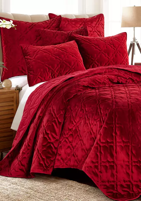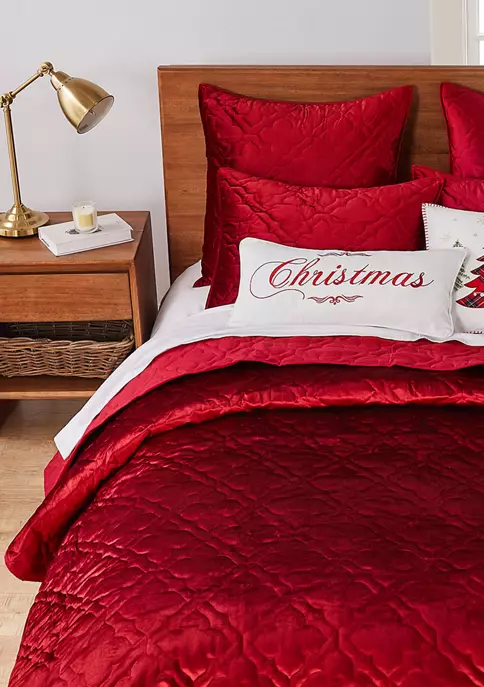 The Caserta Reversible Full/Queen Quilt by Birch Hill is inspired by antique European wallcoverings and tapestries. Offered in classic red, this design will immediately transform your bedroom. This reversible quilt features a medallion stitched pattern rich velvet on the front, reversing to a solid vibrant red on the back. The Full/Queen Quilt (86″ x 86″) is velvet front and microfiber back, filled with a cotton-rich filler and is machine washable. Enjoy this for years to come!