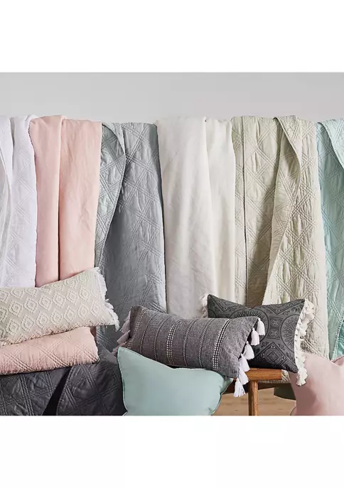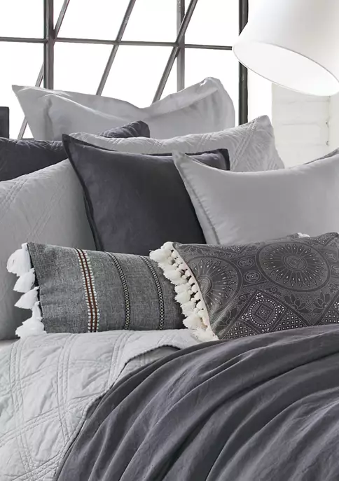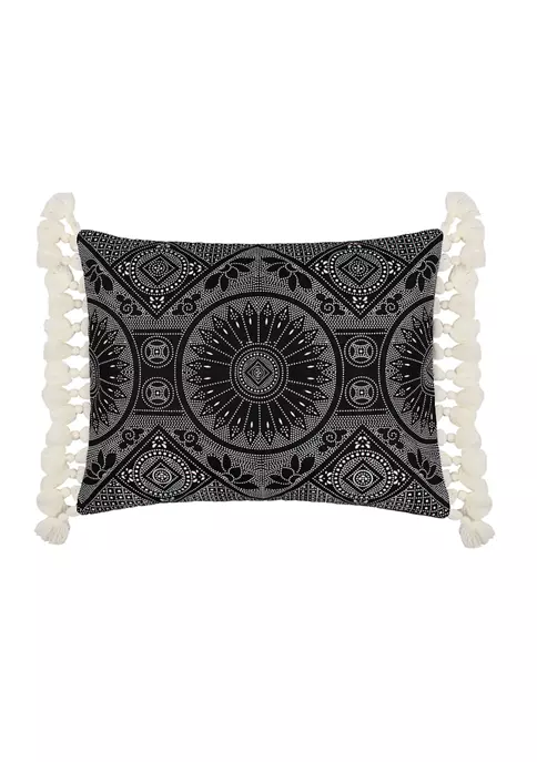 The Black Crewel Stitch Tassel Pillow easily elevates the look of your home. This pillow is sized at 14x18in. and features a uniquely detailed stiched white pattern on black ground with white tassels on the edges. The intricate pillow design can elevate the look of your bed, couch or favorite chair. The pillow comes pre-filled with a soft luxurious feather inner.