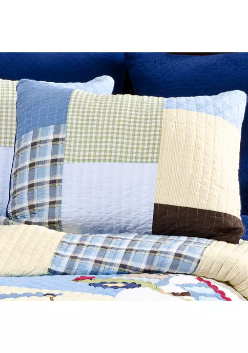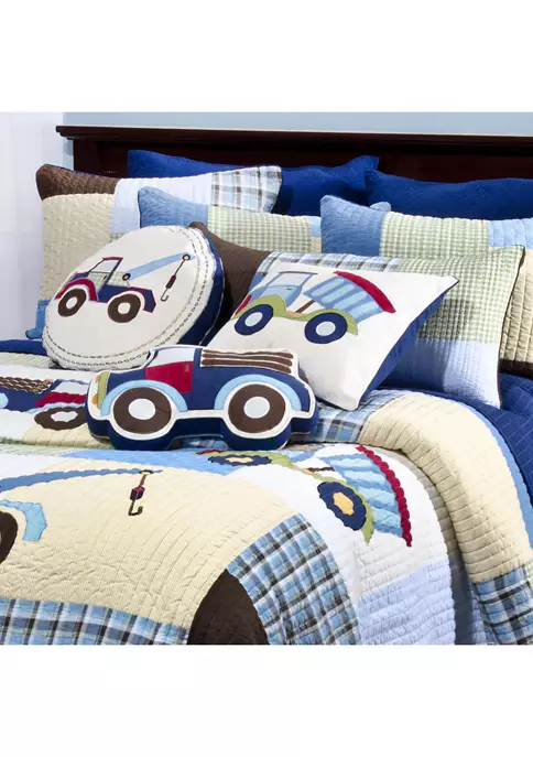 The Trucks Reversible Twin/Twin XL Kids Quilt Set by Levtex Home is inspired by construction trucks at work. Offered in brown, blue, yellow, navy, green, and white, this design will immediately transform your kid’s bedroom. This reversible quilt features a classic patchwork with various patterns and colors and appliquรฉd work trucks in the center on the front, reversing to solid navy on the back. The Twin/Twin XL Quilt and Sham have a cotton front and back, are filled with polyester filler, and are machine washable. Your little boy will enjoy this set for years to come!