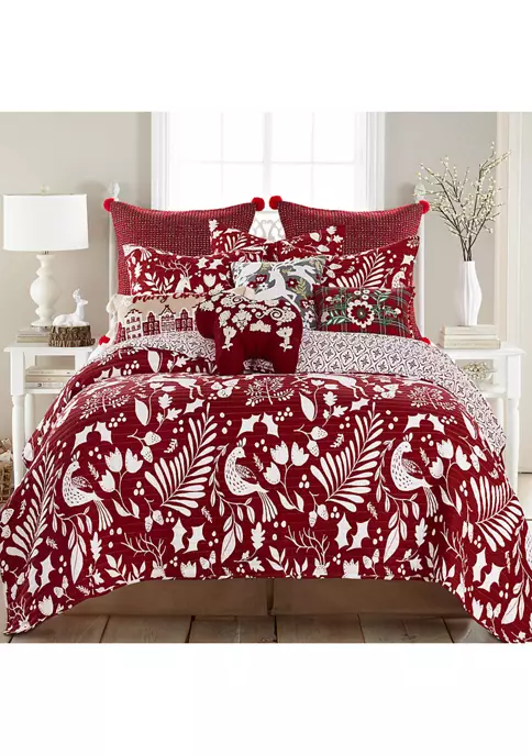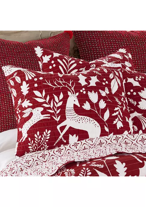 The Bretton Woods Quilted King Sham by Oscar & Grace for Levtex Home is inspired by traditional Scandinavian folk printing. Offered in red and white, this design will immediately transform your bedroom. This sham features woodland animals, leaves and holly in cotton on the front, reversing to a red and white medallion in microfiber on the back. The King Sham (36x20in.) is quilted with a cotton rich filler and is machine washable. Pillow inner not included. Enjoy this for years to come!