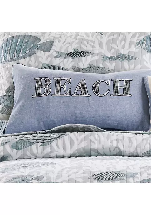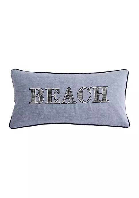 The Woven Plaid decorative pillow matches perfectly with the Levtex Home Cambria bedding collection. This pillow is sized at 12 inches by 24 inches and features the word BEACH appliquΓ©d and embroidered in navy and white on a slub chambray-colored ground and edged in navy. The color palette makes this a versatile accessory for your bed, couch, or favorite chair. The pillow comes pre-filled with a soft, luxurious feather inner.