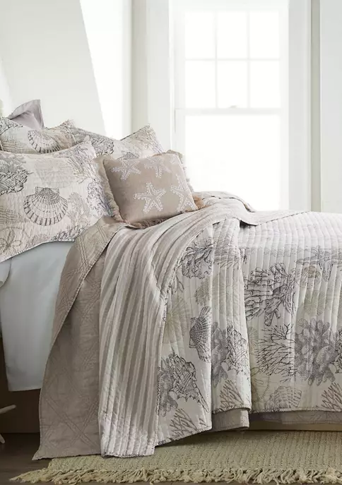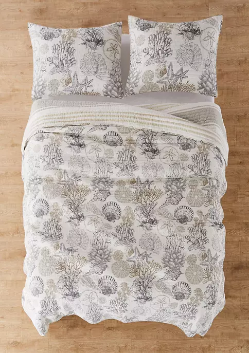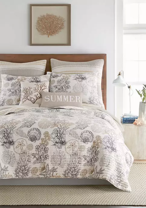 The Capian Sea Neutral Reversible Full/Queen Quilt Set by Levtex Home is inspired by a sun-kissed vacation on a sandy island. This intricate coastal design will immediately transform your bedroom. Made with the softest lightweight cotton, this reversible quilt features a starfish, shells and coral in shades of taupe and grey on a cream ground, reversing to a cream, grey and taupe stirpes on the other. The Full/Queen Quilt Set is machine washable and includes the quilt (88x92in.) and two standard pillow shams (26x20in.) Enjoy this for years to come!