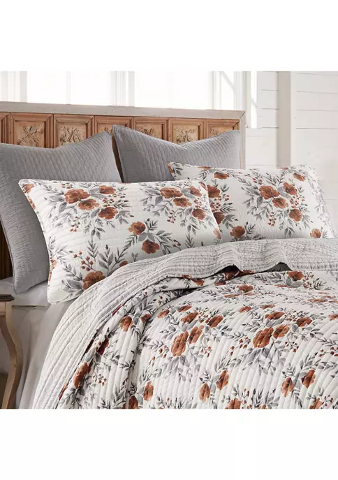 The Charlotte Floral Reversible Quilt Set by Levtex Home is inspired by a garden stroll in the fall. Offered in burnt orange, gray, and white, this design will immediately transform your bedroom. This reversible quilt features clusters of floral bouquets in shades of burnt orange and gray on the front, reversing to a gray pinstripe on white on the back. The quilt and sham have a microfiber front and back, are filled with a cotton-rich filler, and are machine washable.