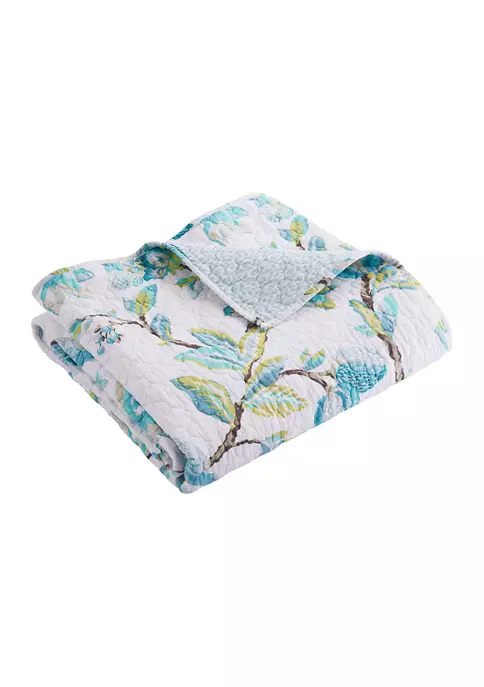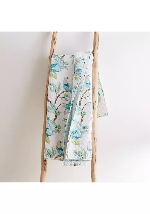 The Cressida Reversible Quilted Throw by Levtex Home is inspired by antique wallpaper. Offered in shades of teal, blue, green, and taupe, this design will immediately transform your dΓ©cor. Made with the softest lightweight cotton, this reversible quilted throw features a gorgeous vine floral and birds in soft shades of teal and green on the one side, reversing to a small ikat design on the other. The Quilted Throw is machine washable and is sized at 50 inches by 60 inches. Enjoy this for years to come!