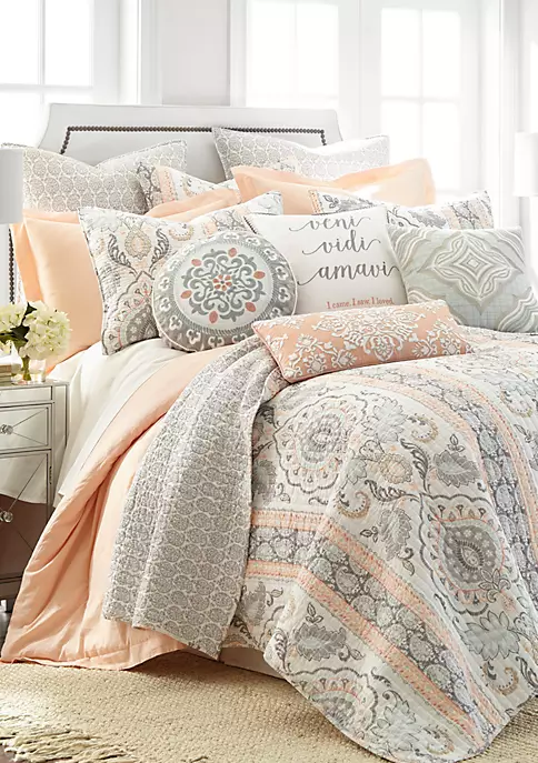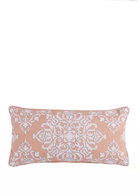Featured in brilliant coral, the Darcy Silver Stitch Pillow from Levtex Home features a detailed white and silver medallion that adds a touch of color to your decor.