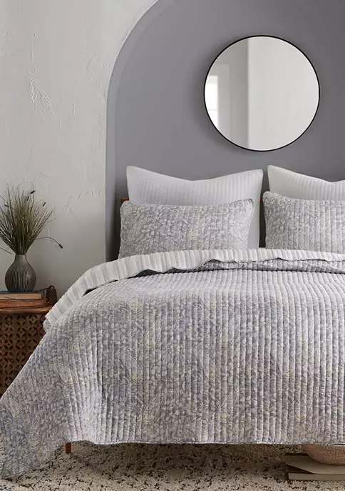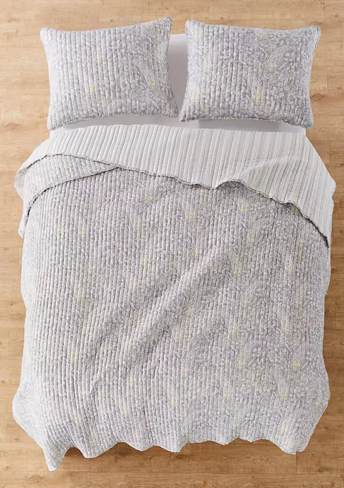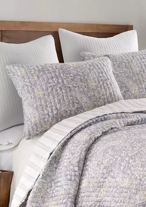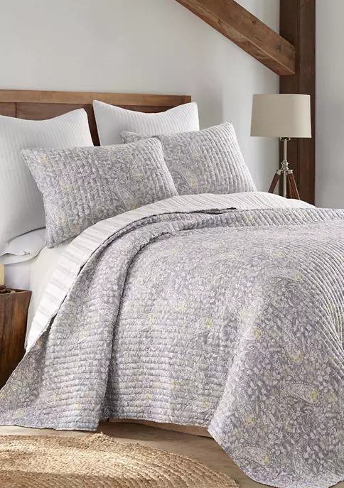 The Emma Paisley Reversible Quilt Set by Levtex Home is inspired by traditional paisley patterns. Offered in gray, ochre yellow, and white, this design will immediately transform your bedroom. This reversible quilt features floral vines and paisleys in relaxing shades on the front, reversing to a striped gray and ochre yellow geometric on white on the back. The quilt and shams have a microfiber front and back, are filled with a cotton-rich filler, and are machine washable.