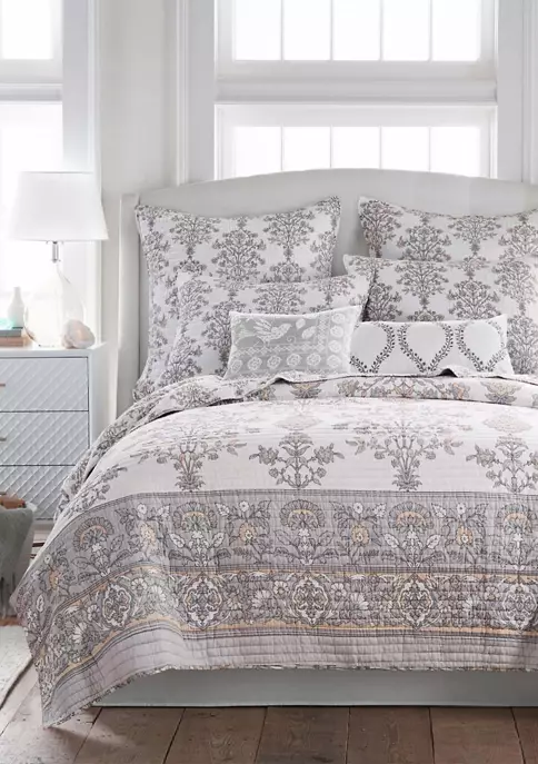 The Filigree Quilted Euro Sham by Levtex Home is inspired by antique European wallcoverings and tapestries. Offered in blush, grey and off white, this design will immediately transform your bedroom. These shams feature small blush and grey floral vines on off white. The Euro Sham (26x26in.) is microfiber, quilted with a cotton rich filler and is machine washable. Pillow inner not included. Enjoy this for years to come!