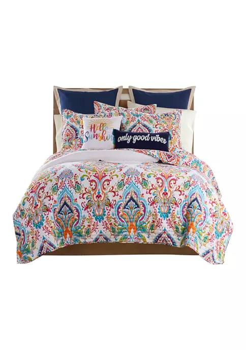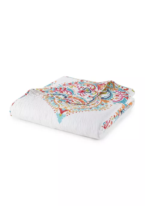 The Formosa Reversible Twin Quilt Set by Levtex Home is inspired by the intricate patterning in woven scarves. Offered in cream, teal, orange and fuchsia, this design will immediately transform your bedroom. This reversible quilt features oversized medallions ascending from the bottom of the quilt in vibrant colors on a cream gound on the front, reversing to a myriad of smaller medallions on the back. The Twin Quilt (68x86in.) and Sham (20x26in.) have a cotton front and cotton back, filled with a cotton-rich filler, and are machine washable. Enjoy this for years to come!