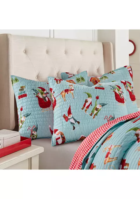 The Gnome for the Holidays Quilted King Sham by Merry & Bright for Levtex Home is inspired by holiday stories and children’s holiday paintings. Offered in red, white, green, teal, and taupe, this design will immediately transform your bedroom. These shams feature gnomes dressed for Christmas, riding sleighs and bringing gifts on the front, reversing to a red and white check on the back. The king-sized sham is microfiber, quilted with a cotton rich filler and is machine washable. Pillow inner not included. Enjoy this for years to come!