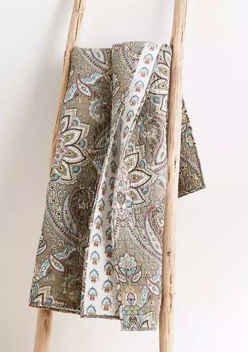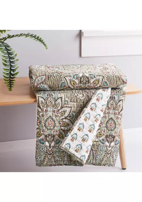 The Kassandra Reversible Quilted Throw by Levtex Home is inspired by classic European tapestries. This medallion quilt design will immediately transform your bedroom. Made with the softest lightweight cotton, this reversible throw features an intricate taupe and beige large scale medallion with hints of red, teal and green, reversing to a teal and red mini-medallions on a cream ground on the other. The Quilted Throw is perfectly sized at 50x60in. and is machine washable. Enjoy this for years to come!