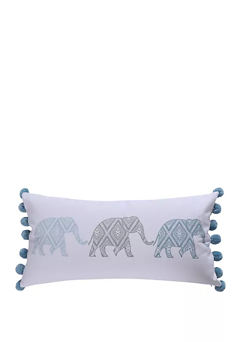 Featuring blue side pompoms and elephants with tribal designs, the Kavi Elephant Poms Pillow from Levtex Home is an adorable addition to your dΓ©cor.