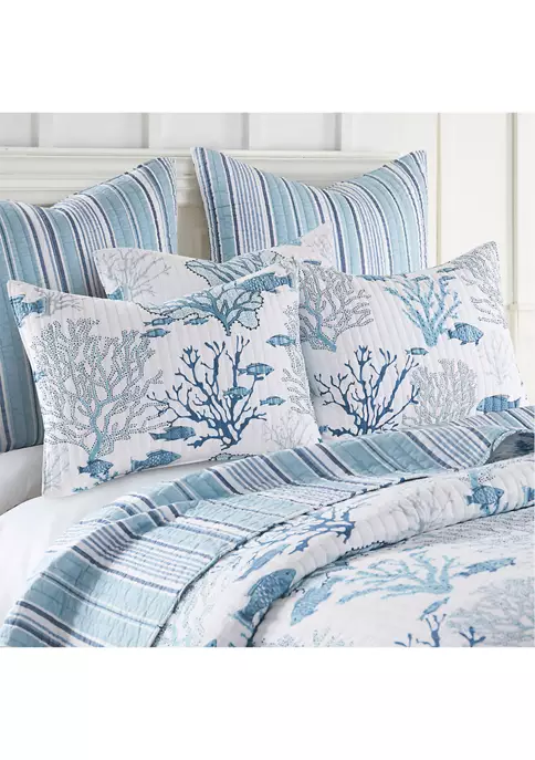 The Lacey Sea Reversible King/Cal King Quilt Set by Levtex Home is inspired by a snorkeling trip on a gorgeous coral reef. This intricate coral design will immediately transform your bedroom. Made with the softest lightweight cotton, this reversible quilt features a fish and coral in shades of blue on an off white ground, reversing to a blue and white stripe on the other. The King/Cal King Quilt Set is machine washable and includes the quilt (106x92in.) and two king pillow shams (36x20in. ) Enjoy this for years to come!