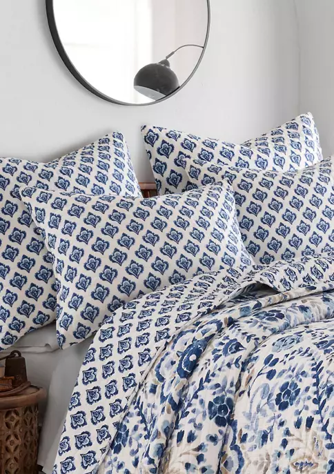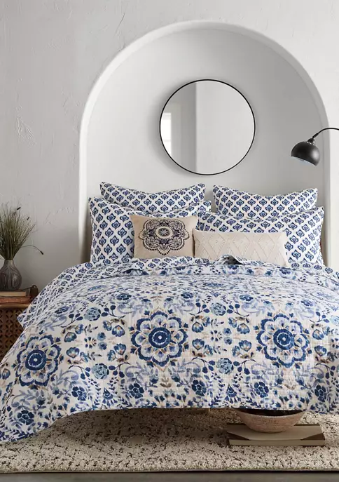The Lorrance Reversible King Quilt Set by Levtex Home is inspired by beautiful floral gardens. Offered in blue, navy, taupe and white, this design will immediately transform your bedroom. This reversible quilt features a rich collection of medallions and flowers on the front, reversing to a small leaf pattern in navy on white on the back. The King Quilt (106x92in.) and two Shams (20x36in.) have a cotton front and cotton back, filled with a cotton-rich filler and are machine washable. Enjoy this for years to come!