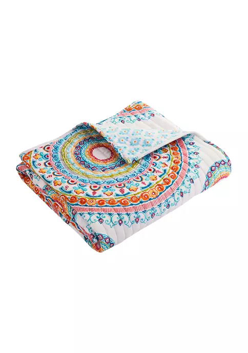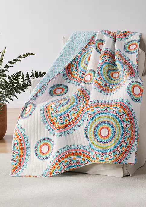 The Mayla Quilted Throw by Levtex Home is inspired by the intricate patterning in bright woven scarves. This bright design will immediately transform your home. Made with the softest lightweight cotton, this reversible quilted throw features a cascade of bright medallions on the one side, reversing to a muliticolor ditsy ikat medallion on the other. The Quilted Throw is machine washable and is sized at 50 inches by 60 inches. Enjoy this for years to come!