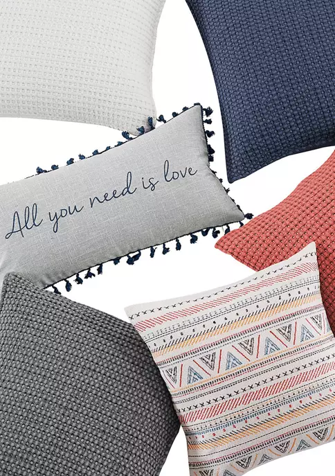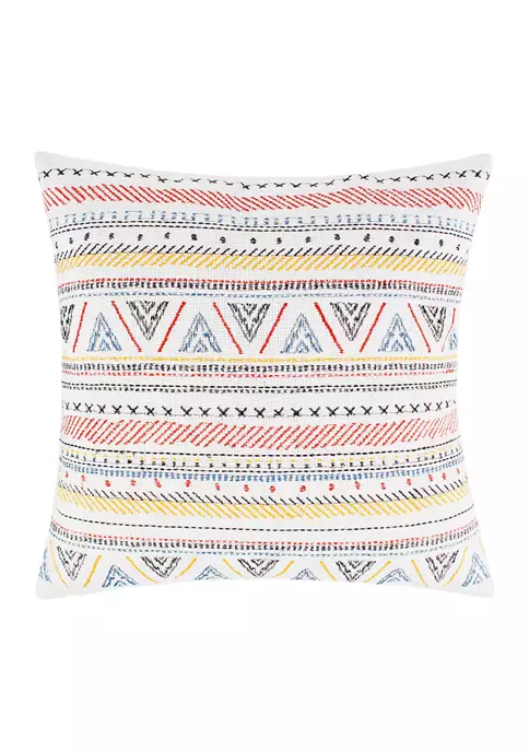 The Multi Stripes decorative pillow matches perfectly with the Levtex Home Mills bedding collection. This pillow is sized at 18″ x 18″ and features embroidered stripes and triangles on a white ground. The red, navy, blue, and orange color palette makes this a versatile accessory for your bed, couch or favorite chair. The pillow comes pre-filled with a soft, luxurious feather inner.