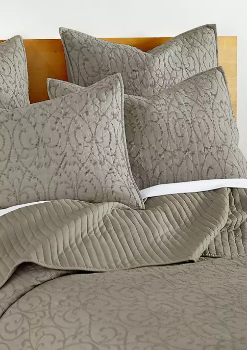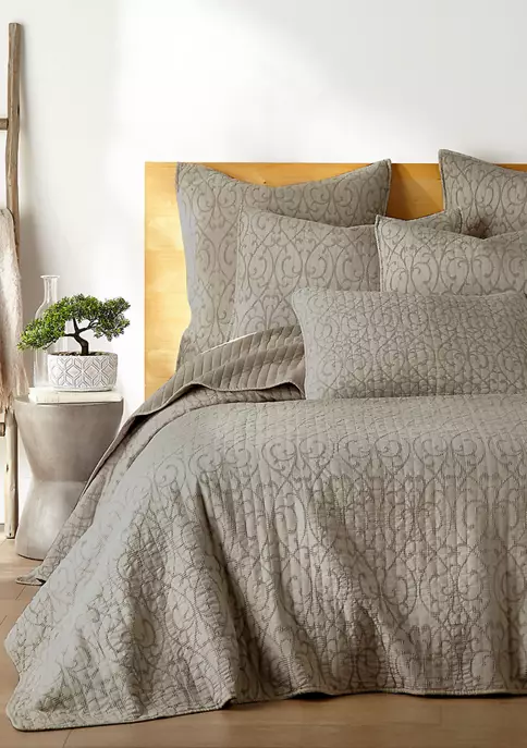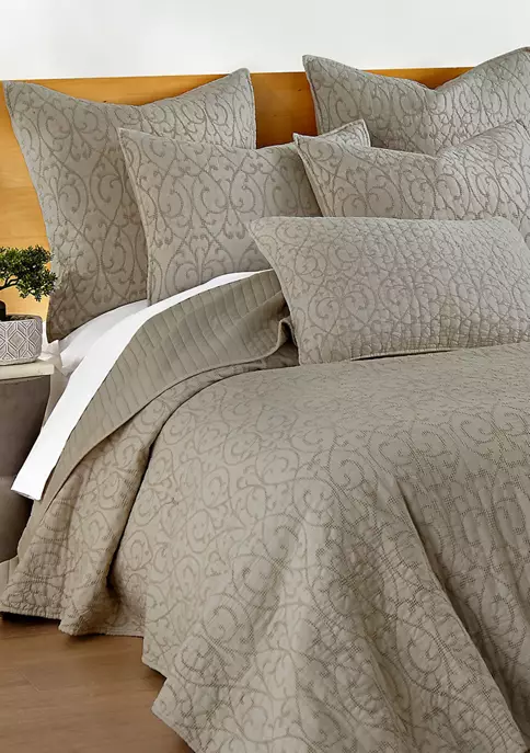 The Beckett King/Cal King Quilt bedding set by Levtex Home is inspired by traditional jacquards. Offered in this perfect shade of Taupe, this design will immediately transform your bedroom. Made with the softest lightweight pre-washed microfiber, this quilt is made from a microfiber damask scroll on the one side, reversing to a solid microfiber in the same color on the other. The King/Cal King Quilt Set is machine washable and includes the quilt (106 x 92 in.) and two king pillow shams (36 x 20 in. ) Enjoy this for years to come!