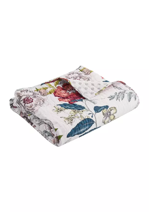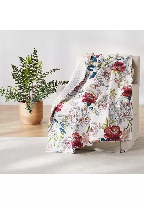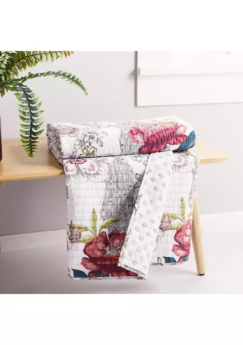 The Montecito Reversible Quilted Throw by Levtex Home is inspired by handpainted European murals. This intricate floral design will immediately transform your bedroom. Made with the softest lightweight cotton, this reversible throw features a toile-like peacock and flowers surrounded by vibrant colorful flowers, reversing to a gray and white medallion on the other. The Quilted Throw is perfectly sized at 50 inches by 60 inches and is machine washable. Enjoy this for years to come!