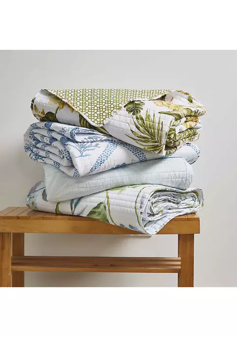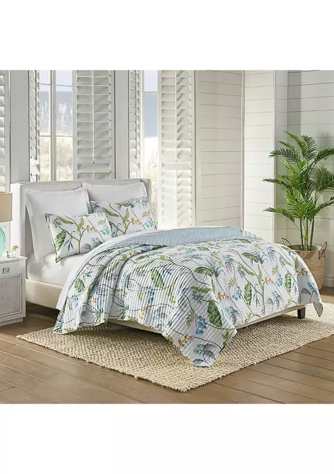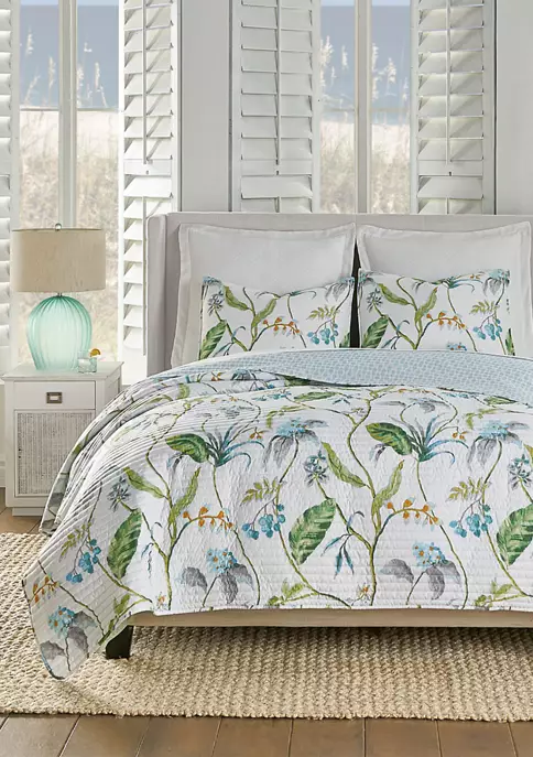 The Monsul Reversible King Quilt Set by Levtex Home is inspired by a lush jungle scene. Offered in green teal grey and white, this design will immediately transform your bedroom. This reversible quilt features painterly flowering plants in a rich tropical paradise on a white ground on the front, reversing to a teal and white leaf print on the back. The King Quilt (106x92in.) and two Shams (20x36in.) have a microfiber front and polyseter back, filled with a cotton-rich filler and are machine washable. Enjoy this for years to come!