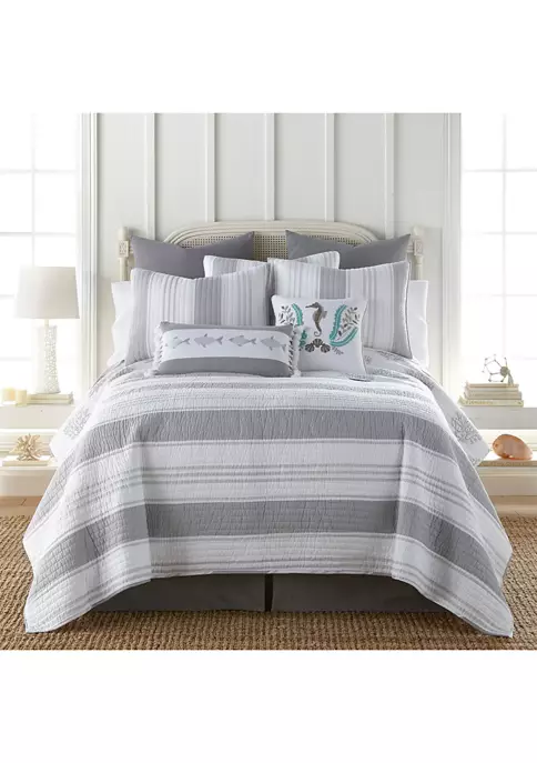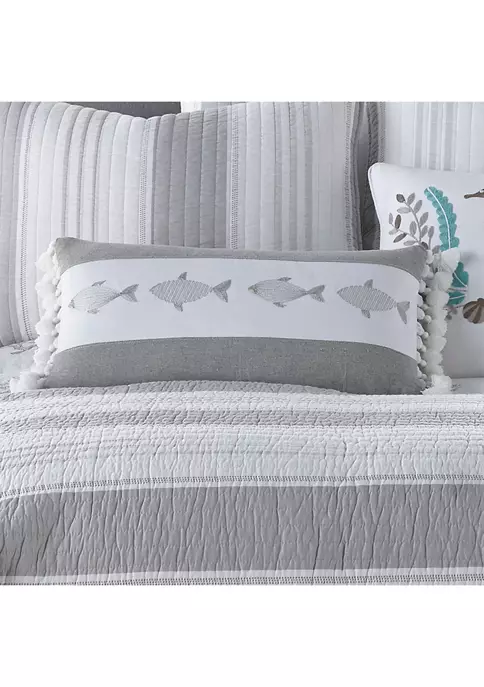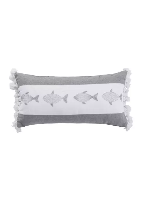 The Fish decorative pillow matches perfectly with the Levtex Home Freeport bedding collection. This pillow is sized at 12x24in. and features delicately detailed fish embroidered in silver thread on a grey & white classic natural canvas ground. The soothing, coastal color palette makes this a versatile accessory for your bed, couch or favorite chair. The pillow comes pre-filled with a luxurious feather inner.