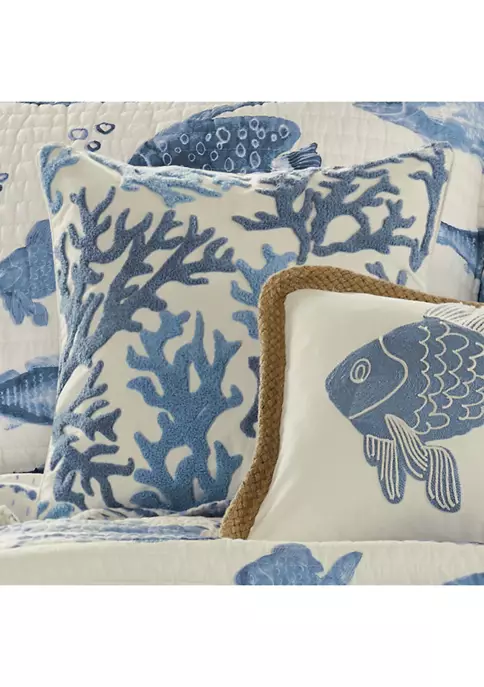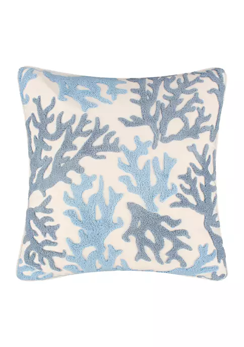 The Embroidered Coral decorative pillow matches perfectly with the Levtex Home Pataya bedding collection. This pillow is sized at 18 inches by 18 inches and features a pattern of coral crewel stitched in shades of blue on a cream canvas ground. The color palette makes this a versatile accessory for your bed, couch, or favorite chair. The pillow comes pre-filled with a soft, luxurious feather inner.
