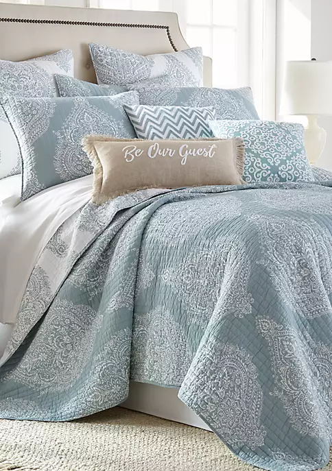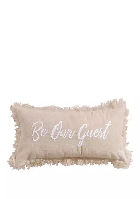 The Levtex Home Pembroke Spa Be Our Guest Pillow features embroidery in white on a fringed natural ground to invoke relaxing energy in your space. This 12-inch x 24-inch pillow has a machine washable shell, is made of blended linen cotton and includes a duck feather insert.