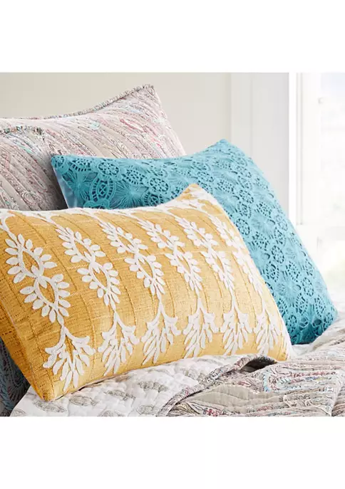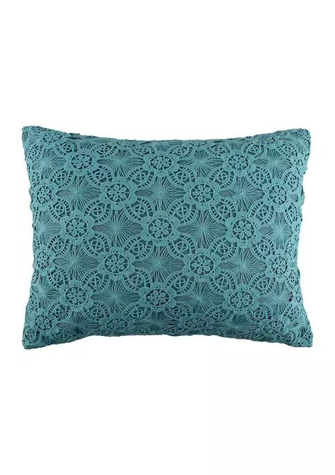 The Lace Overlay decorative pillow matches perfectly with the Levtex Home Presidio bedding collection. This pillow is sized at 14x18in. and features an intricate teal lace overlay on a teal ground. The teal color palette makes this a versatile accessory for your bed, couch or favorite chair. The pillow comes pre-filled with a soft, luxurious feather inner.