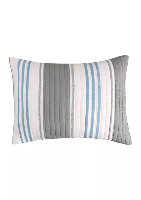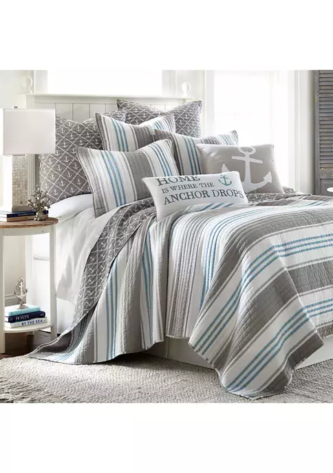 The Provincetown Quilted Standard Sham by Levtex Home is inspired by modern nautical influences. Offered in grey, white, and blue, this design will immediately transform your bedroom. This sham features simple, striped design in blue and grey in cotton on the front, reversing to a white anchors on a grey ground on the back. The Standard Sham (26x20in.) is quilted with a cotton rich filler and is machine washable. Pillow inner not included. Enjoy this for years to come!