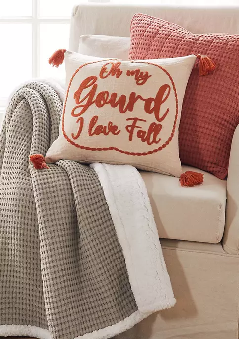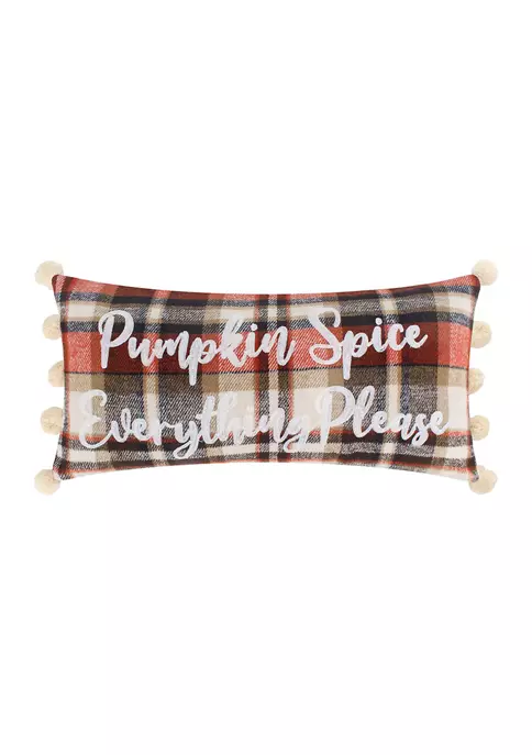 The Word Decorative Pillow (12″ x 24″) by Levtex Home features the words Pumpkin Spice Everything Please intricately embroidered in white script on a plaid orange ground and multi poms on sides. The pillow comes filled with a removable feather filler, perfect for your bed, sofa or favorite chair. Fill your home with holiday cheer!