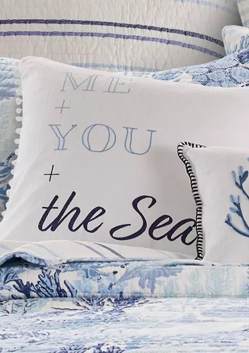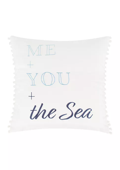 The Embroidered Words decorative pillow matches perfectly with the Levtex Home Reef Dream bedding collection. This pillow is sized at 18x18in. and features the words ME+YOU+THE SEA embroidered in blue and navy on a white ground with pom poms on the sides. The white, blue and navy color palette makes this a versatile accessory for your bed, couch or favorite chair. The pillow comes pre-filled with a soft, luxurious feather inner.
