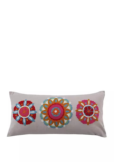 The Levtex Home Rhapsody Medallion Pillow features three embroidered medallions on a taupe ground that will give your space a boho-chic pop of color. This 12-inch x 24-inch pillow has a machine washable shell, is made of 100% cotton, and comes with a duck feather insert.