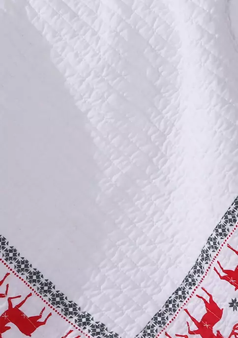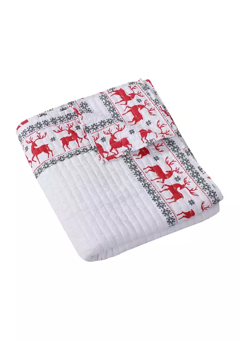 The Rudolph Reversible Quilted Throw by Levtex Home is inspired by simple Scandinavian design. Offered in red, gray, and white, this design will immediately transform your bed, couch, or favorite chair. Made with the softest lightweight brushed microfiber, this reversible throw features a white ground quilted with an x stitch and a printed border of reindeer and snowflakes on the one side, reversing to the border design expressed as a stripe on the other. The Quilted Throw is machine washable. Snuggle up under this versatile throw while you watch the lights on your Christmas tree twinkle, or tell your favorite holiday stories.