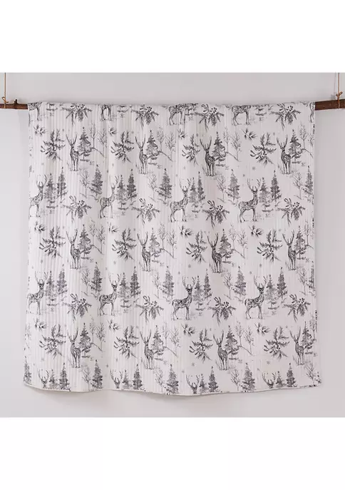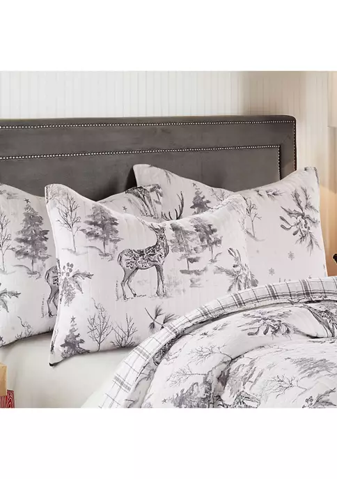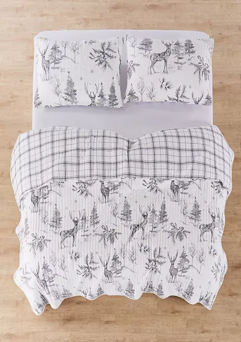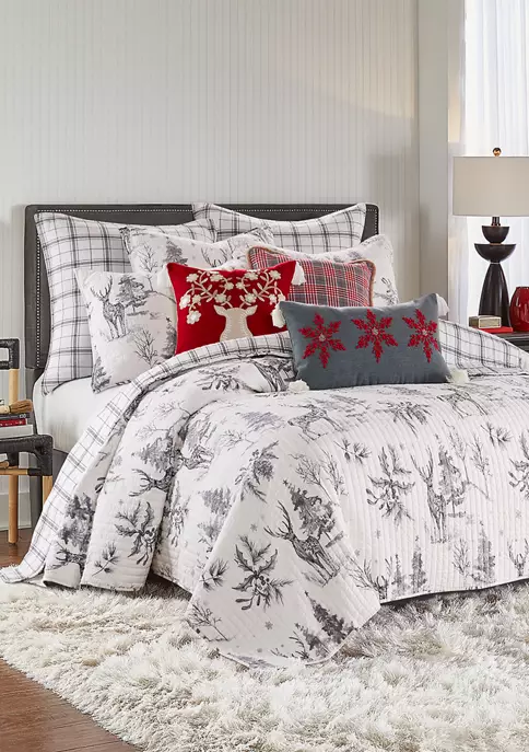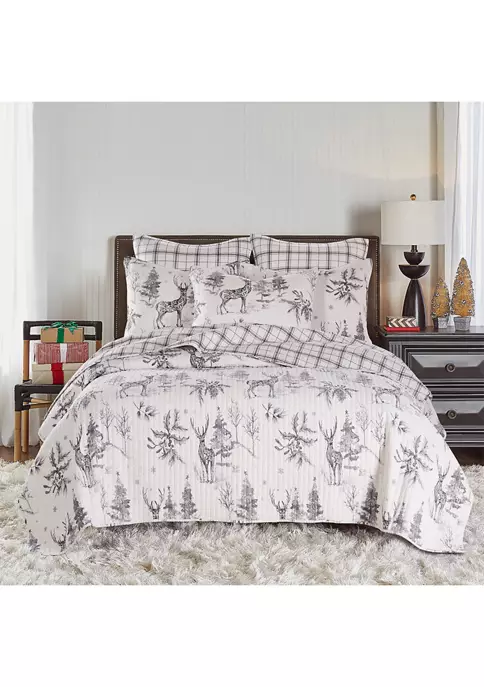 The Sleigh Bells Reversible Twin/Twin XL Quilt by Villa Lugano for Levtex Home is inspired by whimsical winter wonderlands. Offered in grey and white, this design will immediately transform your bedroom. This reversible quilt features deer, Christmas trees and holly in grey and white in cotton on the front, reversing to a grey and white plaid in microfiber on the back. The Twin/Twin XL Quilt (68x86in.) is filled with a cotton rich filler and is machine washable. Enjoy this for years to come!