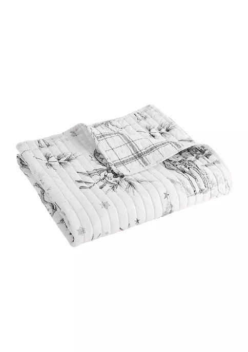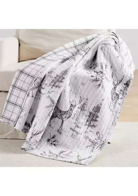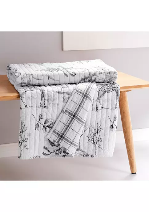 The Sleigh Bells Reversible Quilted Throw by Levtex Home is inspired by whimsical winter wonderlands. Offered in black, greys and white, this design will immediately transform your bed, couch or favorite chair. Made with a durable cotton/poly blend, this reversible throw features deer, Christmas trees and holly in black and greys on a white ground on the one side, reversing to grey and white plaid. Snuggle up under this versatile throw while you watch the lights on your Christmas tree twinkle, or tell your favorite holiday stories.