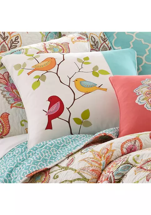 The Birds decorative pillow matches perfectly with the Levtex Home Sophia bedding collection. This pillow is sized at 20 x 20in. and features three gorgeously detailed, appliqued birds on a white and teal pieced pillow. The color palette makes this a versatile accessory for your bed, couch or favorite chair. The pillow comes pre-filled with a soft. luxurious feather inner.