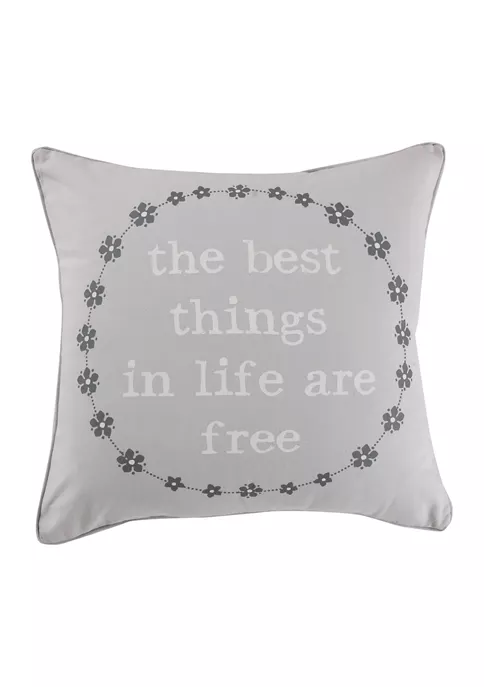 The Best Things decorative pillow matches perfectly with the Levtex Home St. Claire bedding collection. This pillow is sized at 20x20in. and features the words, THE BEST THINGS IN LIFE ARE FREE scripted on a light grey ground with a wreath of flowers surrounding it in complement. The grey color palette makes this a versatile accessory for your bed, couch or favorite chair. The pillow comes pre-filled with a soft. luxurious feather inner.